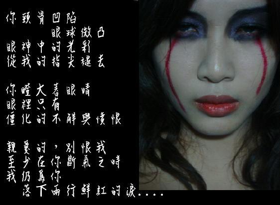 因為我這人不知道有啥毛病,所以愛畫兇狠妝 .....這次的妝....我第一次嘗試Make over..覺得自己終於有第一次的突破~~~這次的妝,我不知道為什麼喜歡得不得了XD 這次的妝,把剛回家的老公嚇得倒彈了幾步,然後一直丟給我化妝棉叫我卸妝... 請要看下去的人要有心理準備,以下有一連串會讓某些人「不酥胡」的照片....(我畫的並不是賞心悅目的厲鬼)如果自認非常怕鬼或恐怖妝的美人們請不要再往下看(←我是認真的) 為了這妝我還寫了一篇小短文,配合此妝的心境,